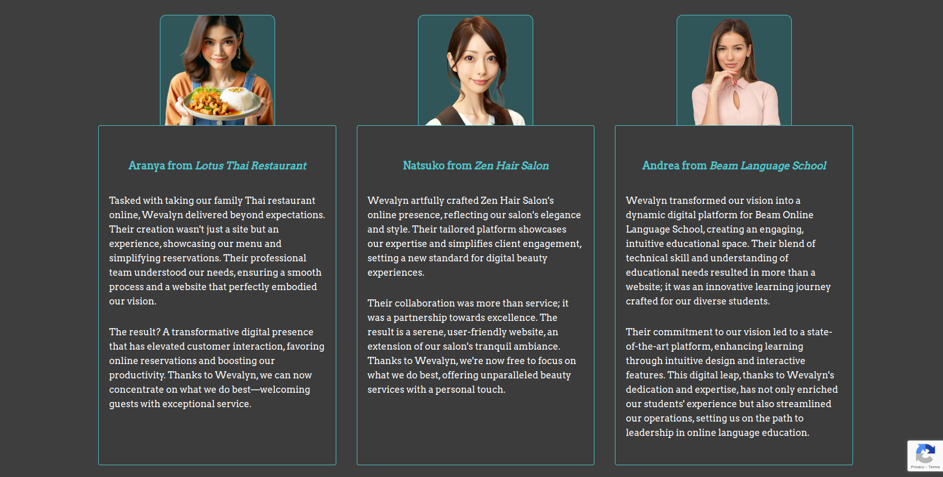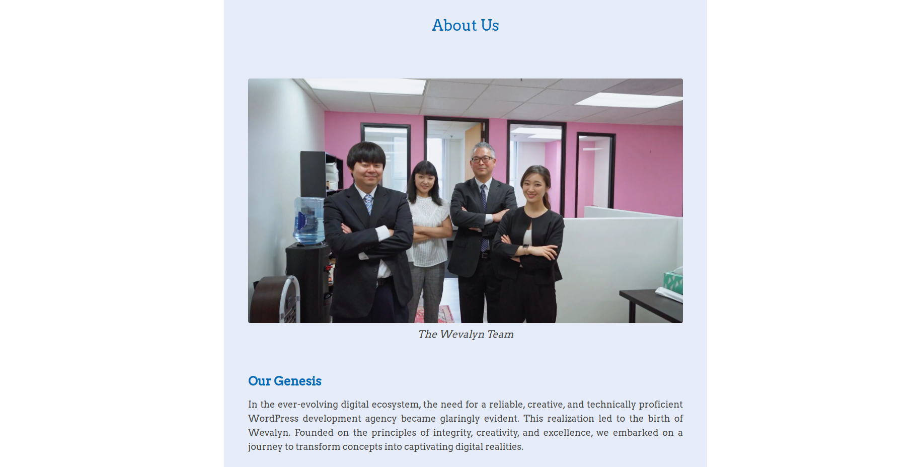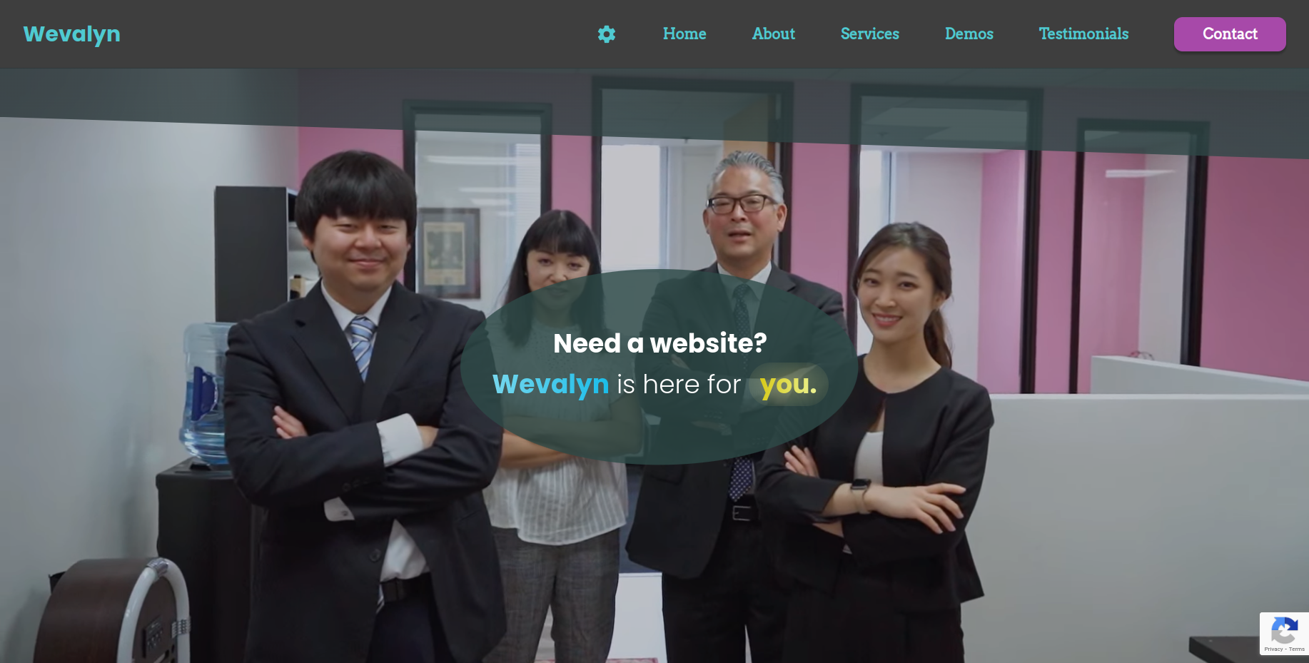 Wevalyn is a fictional Japanese web development agency. The website is available in both Japanese and English and has a light and dark theme.